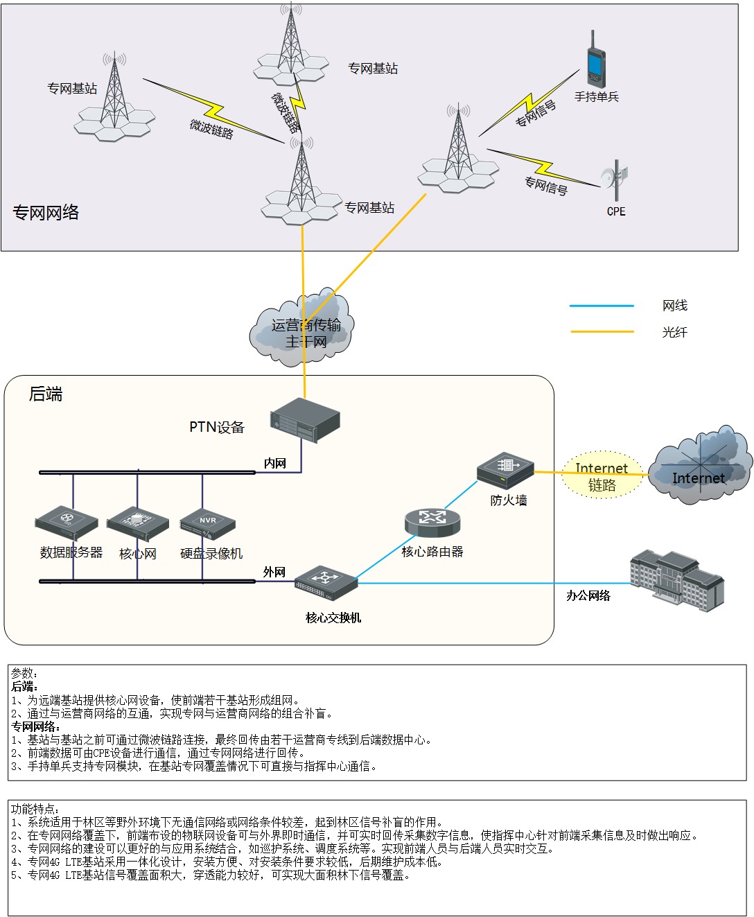 前端設(shè)備主要由4G LTE基站與天線組成,根據(jù)用途不同,可選配1/2/3根天線,基站覆蓋范圍保守估計(jì)半徑10KM,多臺(tái)基站組網(wǎng)時(shí)可以通過光纖和網(wǎng)橋方式組網(wǎng)(建議光纖)